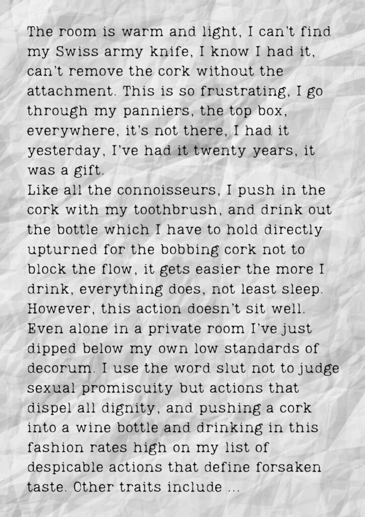 Pushing a cork into a wine bottle and drinking direct from said bottle by inverting it.